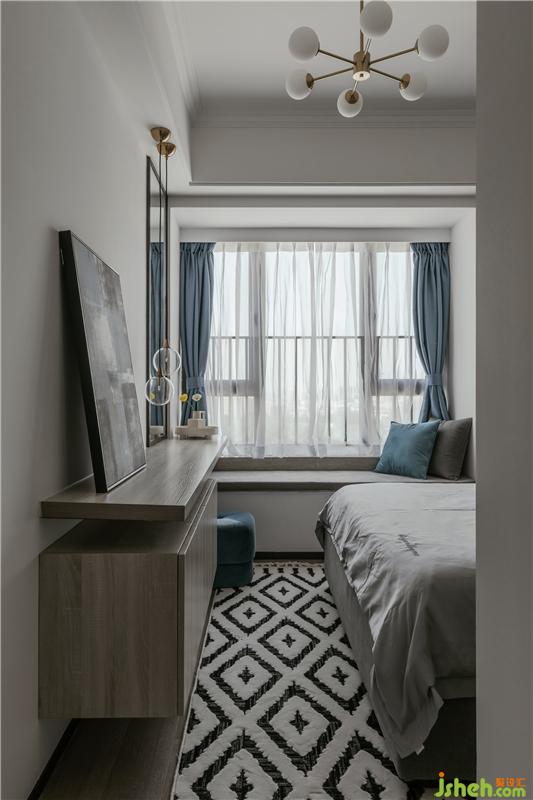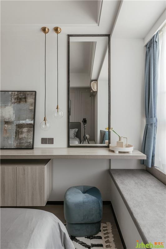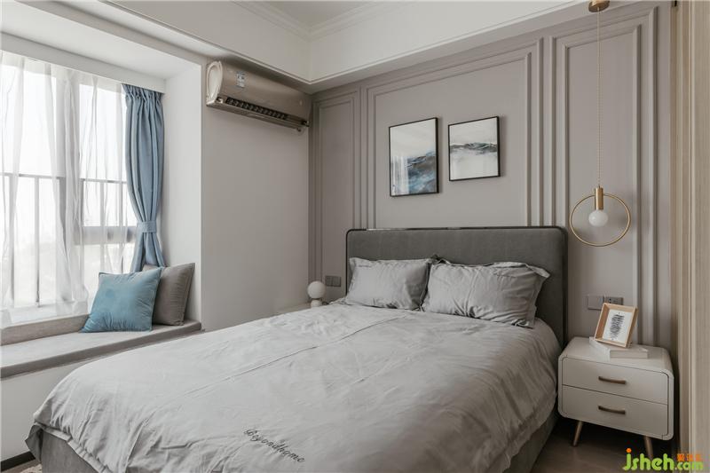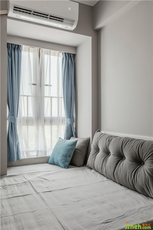 灰色的床品,奶灰色的背景讓整個裝修設(shè)計(jì)風(fēng)格得以延伸,設(shè)計(jì)師在軟配上用灰藍(lán)色做點(diǎn)綴,為臥室營造寧靜的氛圍。