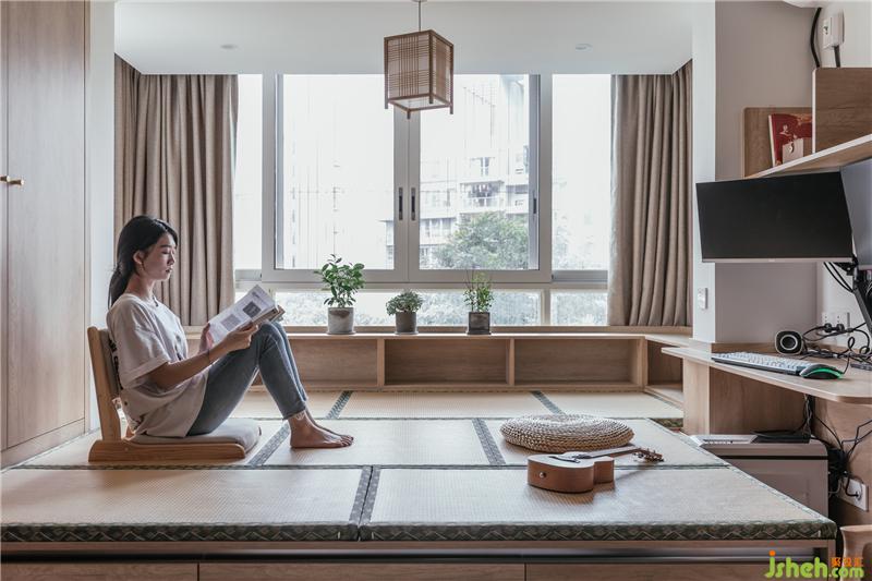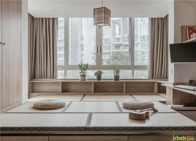 在榻榻米的一側(cè),我們還為男主人設(shè)計出了他的辦公區(qū),腳下區(qū)域留出空間,更加舒適~