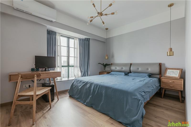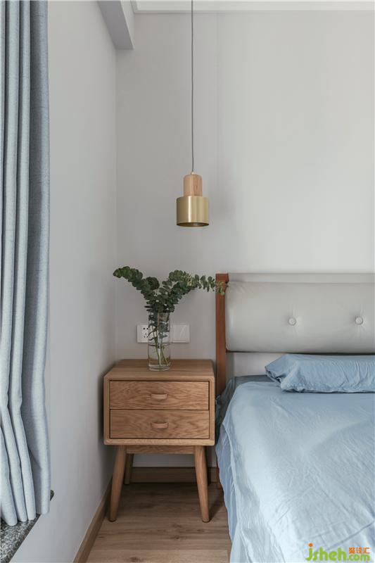 主人房借用了長(zhǎng)輩房的一點(diǎn)空間,做了一個(gè)大衣柜進(jìn)行收納,滿足了夫妻兩人的日常居住需求。臥室延續(xù)外部空間的設(shè)計(jì)元素,作為休息區(qū)域,塑造的氣氛更為靜謐優(yōu)雅。原木、棉麻、綠植也在經(jīng)過(guò)紗簾過(guò)濾后的陽(yáng)光下顯得更加柔和。
