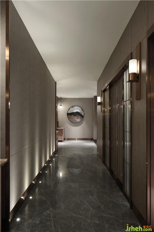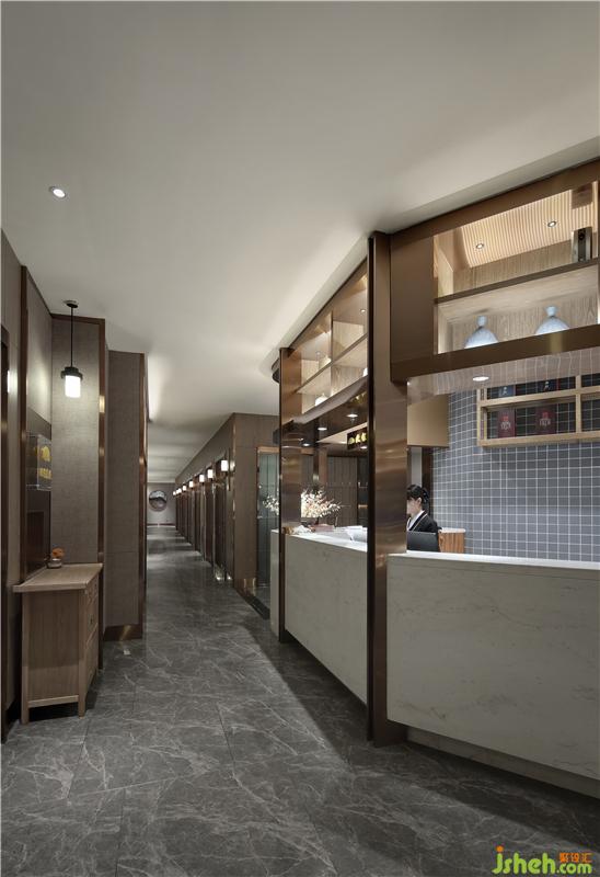 穿過走廊,金屬質(zhì)感的墻面使空間顯得更為開闊,明朗。禮賓落座,環(huán)顧四周,深淺相間的棕黃木色讓人靜心靜氣。偶有一點(diǎn)盆栽的翠綠,好像少女嘴角的美人痣。