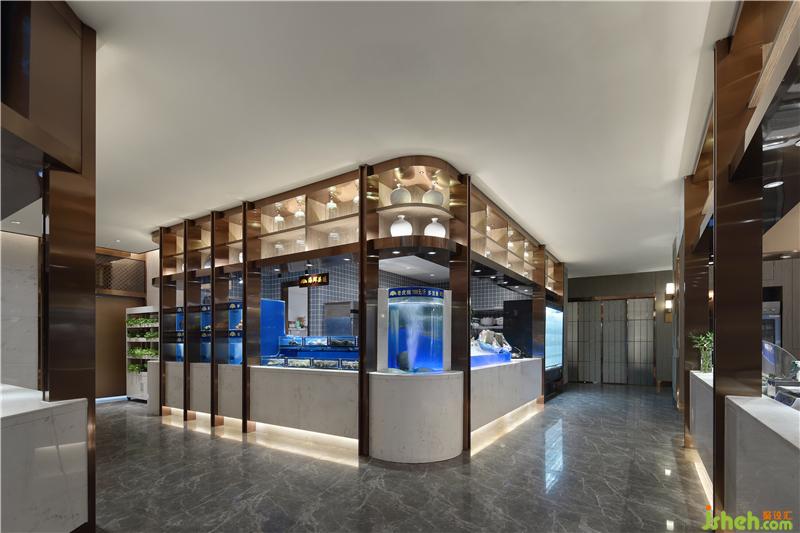 入口海鮮明檔,燈光明快。細(xì)聽水聲潺潺,仿佛魚蝦悠閑自得。古銅色金屬立架擺放十余種茶品,東方飲食的儀式感從食材的挑選開始。