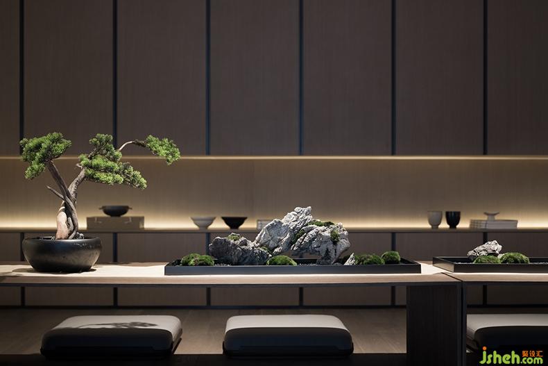 茶室家具木色與硬裝木色相近,為中性暖木色,茶桌不高,旨在讓人進(jìn)入空間學(xué)會(huì)放下自己,盤腿而坐。前座備有琴桌,中座則布有茶席,后座是小景式山石加植物,背面更有日式枯山水相襯,加之側(cè)面墻的展示臺(tái)處展示的中式書籍及不同質(zhì)感的陶瓷盛器。仿佛一場(chǎng)盛大的文人雅集活動(dòng)即將開場(chǎng)。一人撫琴,一人泡茶,眾人低首聆聽。與茶室正側(cè)方懸掛著德梵的《清涼》繪本欲要表達(dá)的一般,“若識(shí)本心,即是解脫”。