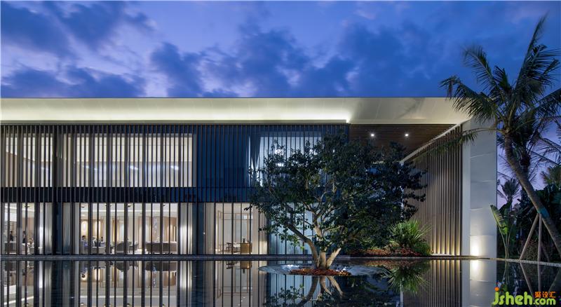 一池半海售樓處是標(biāo)準(zhǔn)的L型單體兩層建筑,整體挑高的玻璃幕墻,即便是在室內(nèi),也能把中庭的水景一覽無余。裝修公司