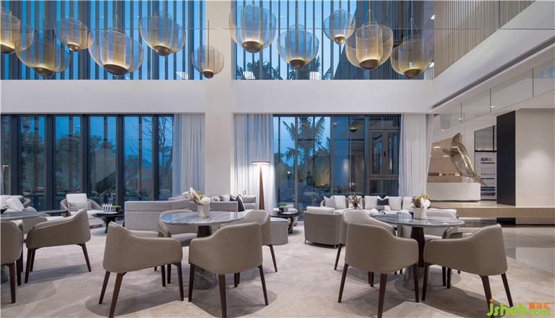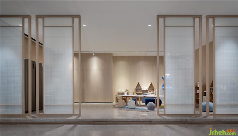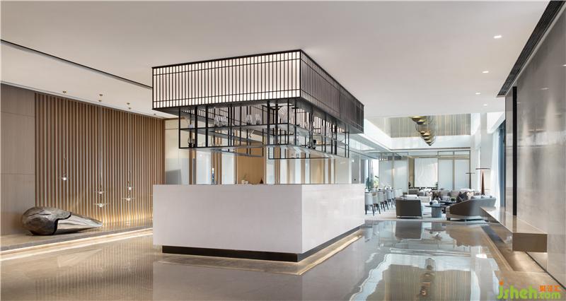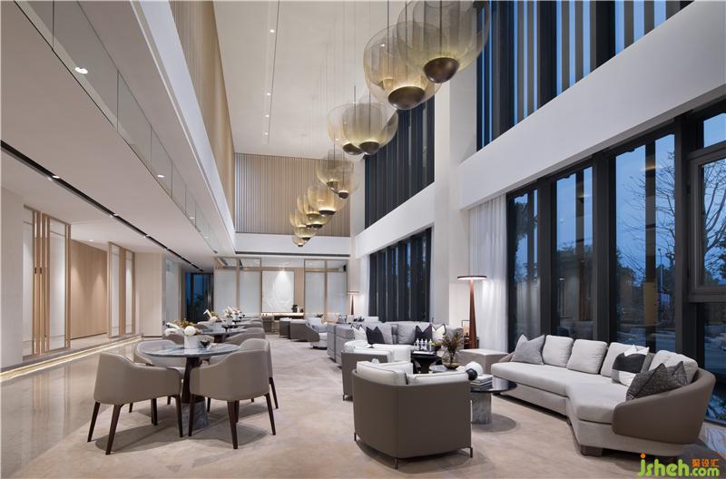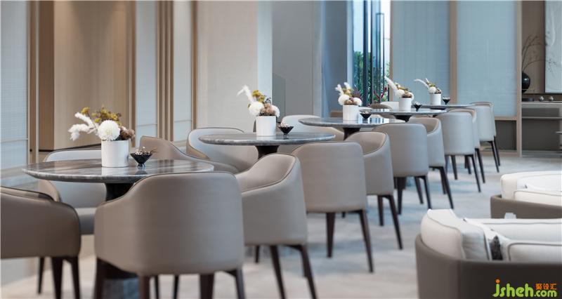 洽談區(qū)倚靠窗邊,窗外一片水景。室內(nèi)大面積以天然木色為基調,暖灰色系皮革與棉麻布藝結合的家具,營造舒適的洽談區(qū)。裝修公司