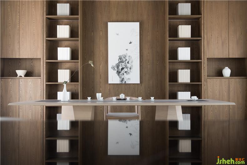客廳選用具有柔和弧度的家具,模擬候鳥的姿態(tài),營造自然的美感,掛畫也選用盛昌年的《柳燕圖》圍繞主題,旁邊的茶室以及餐廳也都選用平靜舒服的色調(diào),其中燈家具形態(tài)也以“候鳥南飛”、海上礁石為靈感,在空間的飾品選擇上秉承著少精于多的理念,多選用自然質(zhì)感的器皿飾品等,讓整個空間顯得精致卻不世俗,自然氣息也更加濃厚。
