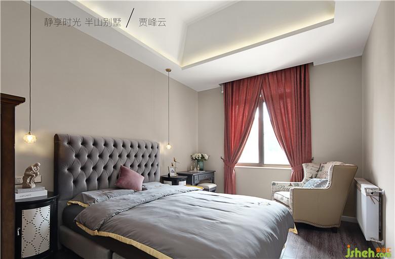臥室格調(diào)優(yōu)雅米灰床具配以紅色麻布窗簾為安靜的休息空間增添些許私密感