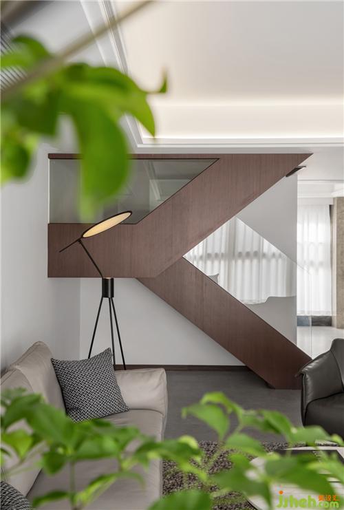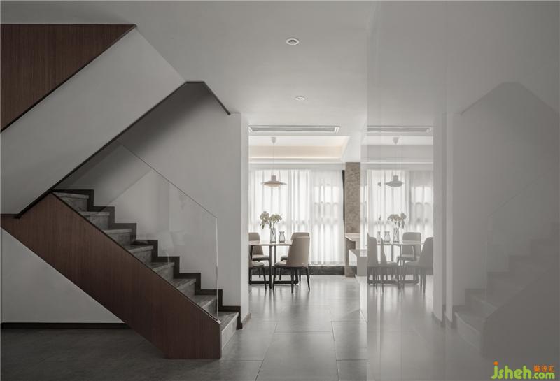 反過來從客廳向餐廳透視亦然,樓梯的雕塑感是讓設計師最為得意之筆,雖然幾經(jīng)周折,但最終落地仍然趨于完美。