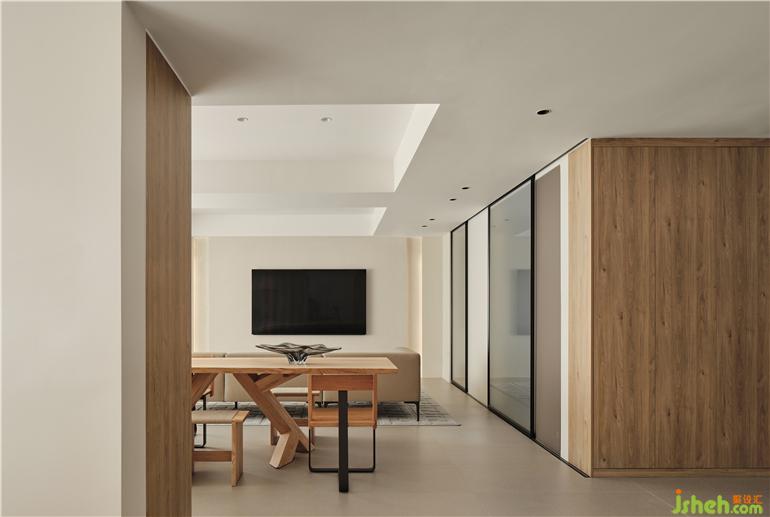 The original balcony space will be integrated into the restaurant and living room to be so open. There is a section of load-bearing wall beside the TV background, and a log color high cabinet is designed for storage. Increasing storage space also enriches the mechanism of facade.