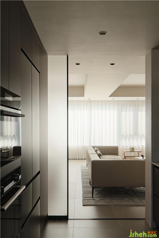 玄關(guān)、廚房、客衛(wèi)采用一字排列,極窄邊框玻璃移門實(shí)現(xiàn)空間的開合轉(zhuǎn)換。鎮(zhèn)江豪宅設(shè)計(jì)移門軌道預(yù)埋到吊頂里面,力求空間的整齊干凈??托l(wèi)的洗漱區(qū)放置了一臺(tái)小型洗衣機(jī),臺(tái)盆對(duì)面墻是到頂?shù)南醋o(hù)用品陳列柜。干凈整潔的生活空間來源于充足合理的收納。