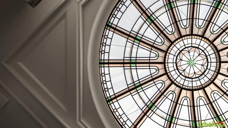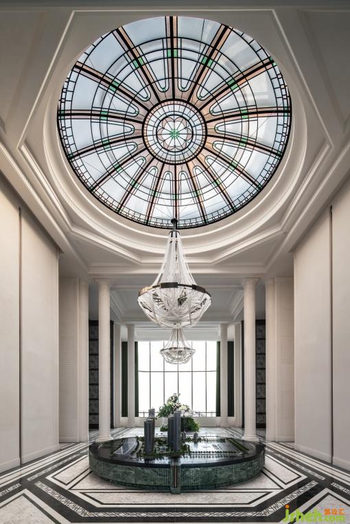 售樓處設(shè)計(jì)汲取美琪大劇院穹頂元素,復(fù)合和平飯店吊頂形式,疊現(xiàn)法式結(jié)構(gòu)的規(guī)則之美;979塊彩色藝術(shù)玻璃鑲嵌凝一,致敬上?!笆镅髨?chǎng)”的繁華綺夢(mèng)。室內(nèi)的立柱與天花的穹頂保持一定的自序及節(jié)奏感,結(jié)合吊燈加強(qiáng)空間的儀式感。
