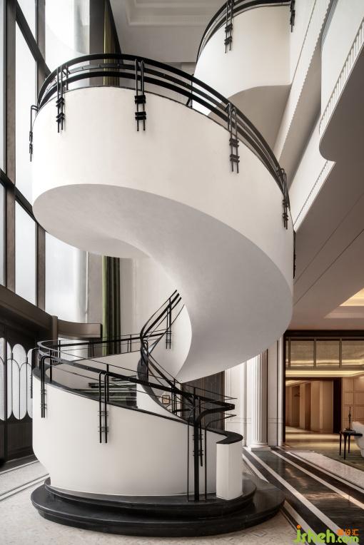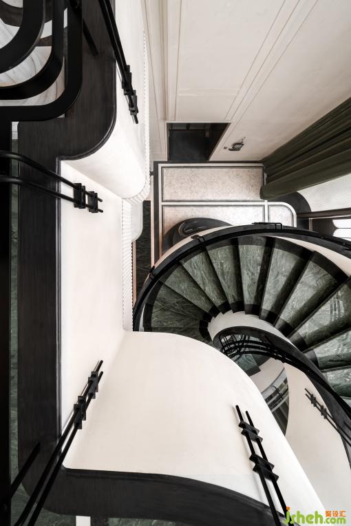 樓梯,既是建筑這個美人的腹“臍”,亦是貫連不同樓層的“軸”——在某個敏感的視覺“焦點”,由一根根似軟實硬的鐵質(zhì)扶手優(yōu)雅地隨梯級走勢勾勒古典同逸趣交融匯歸。