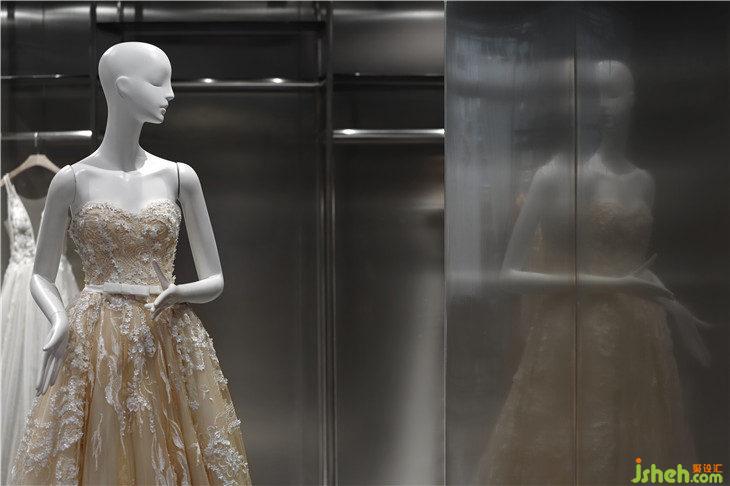 空間運用大量磨砂不銹鋼材質(zhì),以虛實手法大面積鋪設了主體背景墻。不銹鋼材質(zhì)本身的色澤和光感展現(xiàn)出了強烈的包容感,由于不同角度的光源照射以及光源本身的變化,映照在背景墻上的婚紗形狀與色調(diào)也會產(chǎn)生相應變化,令人感覺如夢似幻。