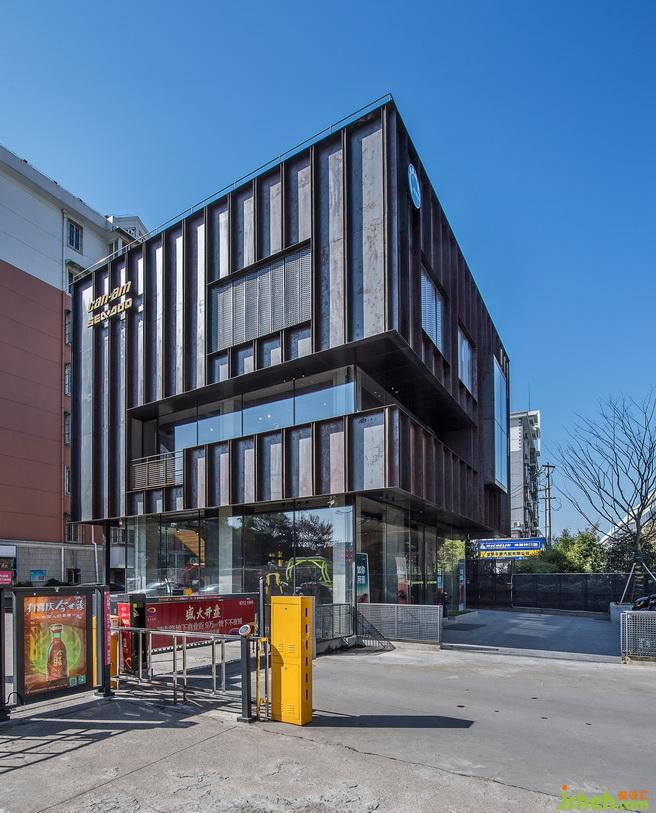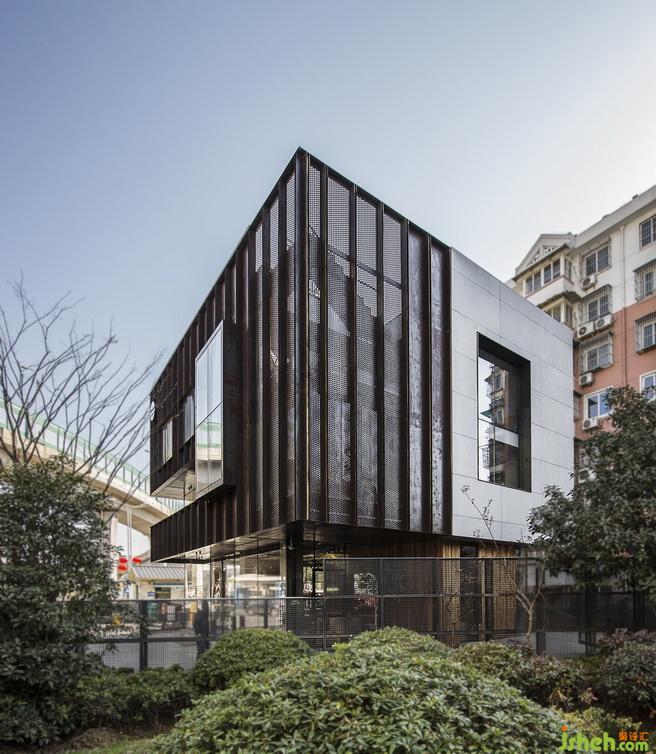 改造后的建筑,整體高度都拔高了。從遠(yuǎn)處看象是一個(gè)站立的盒子,增加了視覺(jué)的沖擊力與趣味性??v向條狀的鋼板,配合朦朧感的沖孔鋼板與扎實(shí)的水泥板,簡(jiǎn)單又直白,打破建筑原有的條條框框,從而表現(xiàn)出一種特別的空間虛實(shí)感,更加強(qiáng)了建筑的立體感。