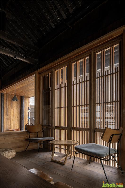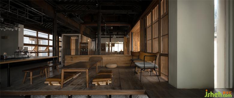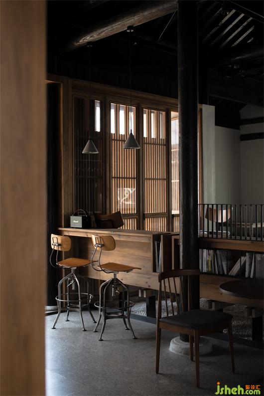 用餐區(qū)中央整體被抬高,形成頗具日式風(fēng)格的榻榻米區(qū),文集設(shè)計(jì)帶有多格書架的實(shí)木吧臺(tái)、水吧及下沉式休閑區(qū)域,讓室內(nèi)空間錯(cuò)落有致,形成一個(gè)有趣的視覺(jué)體系。鄰窗水流聲不絕于耳,樹影婆娑,內(nèi)院景色一覽無(wú)余。