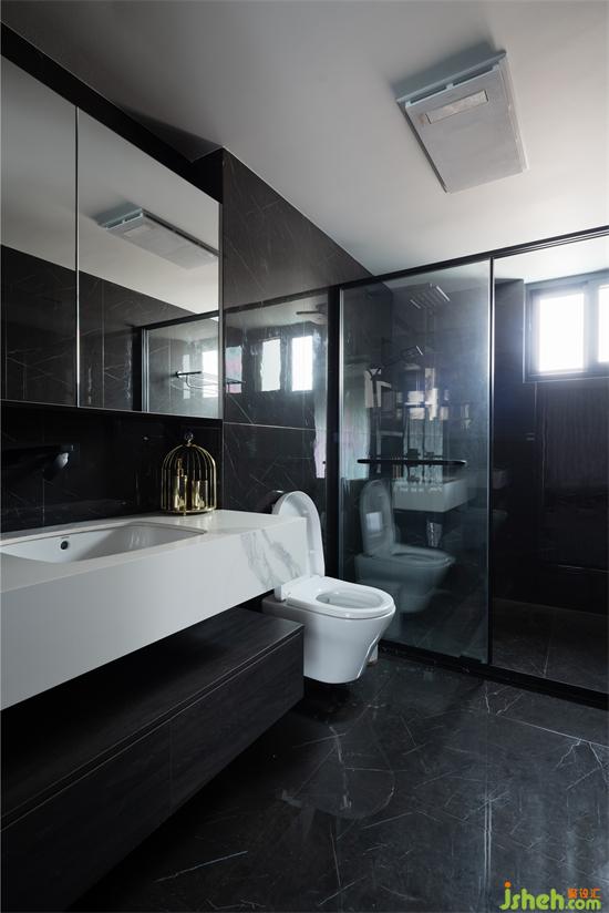 客衛(wèi)干濕分區(qū)由外向內延展,懸空的臺盆與儲物柜,利用黑白碰撞的張力,鑫嘉園家居設計增加空間的輕盈感,干凈純粹。