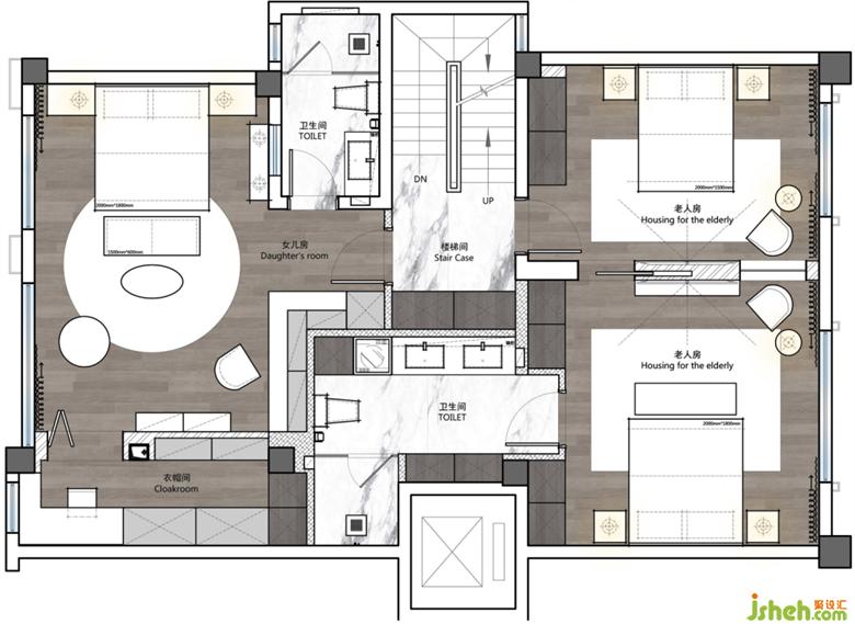2、二樓布局老人套房與兒童房。兒童房把原本鏤空位置做現(xiàn)澆搭建,完善空間,增加使用面積;老人房做分離式套房,看似整體,卻相互獨立;