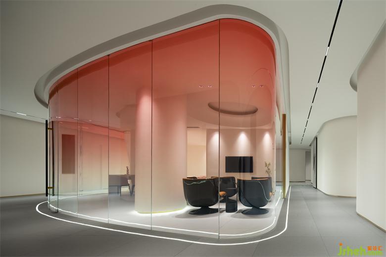 生活美容區(qū)像柔軟的水被裝進(jìn)了一個(gè)異形玻璃容器,佇立在整個(gè)空間中心位置。旗艦店設(shè)計(jì)從上至下透感漸變的紅色幕墻,像是光的指引,醫(yī)美旗艦店裝修設(shè)計(jì)折射出神奇的光影,以流暢、純粹、柔和結(jié)合女性之美帶來萬變的形態(tài)。