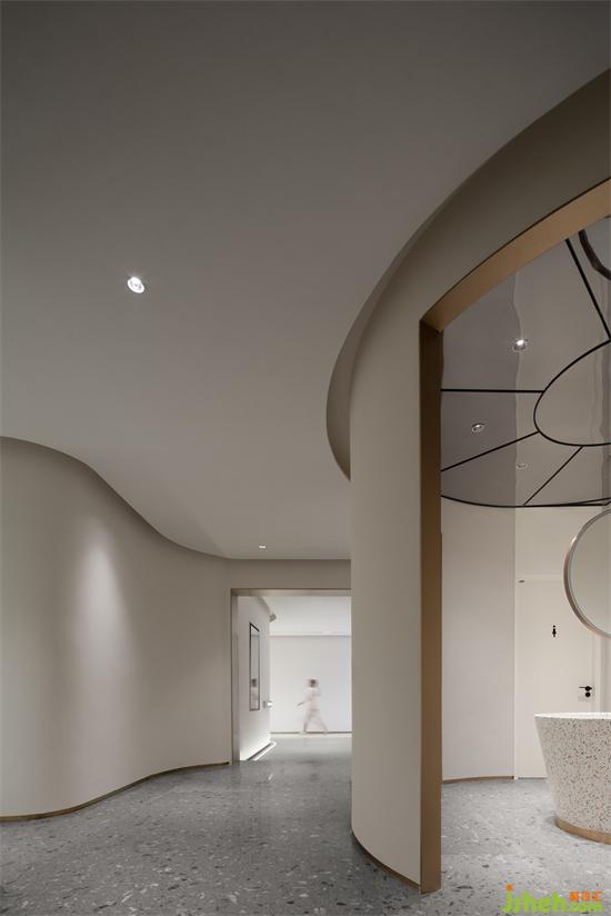波浪、流水、水滴等自然意向的抽象提取,使空間不再呈現(xiàn)規(guī)矩平敘的樣子,純白色的空間以一種既含蓄又大膽的手法鋪敘開來(lái),頂面碩大的橢圓做二次造型,銀色的波紋鋼板嵌入其中,如涌動(dòng)的水面波光粼粼,星星點(diǎn)點(diǎn)的反光成為空間第一視覺焦點(diǎn);醫(yī)美旗艦店裝修設(shè)計(jì)地臺(tái)層層疊疊的曲線猶如小溪涓涓細(xì)流,放上一顆紅色球體,空間的藝術(shù)張力煥發(fā)而出,柔美、流動(dòng)、放松,是人與環(huán)境關(guān)系最好的調(diào)和。