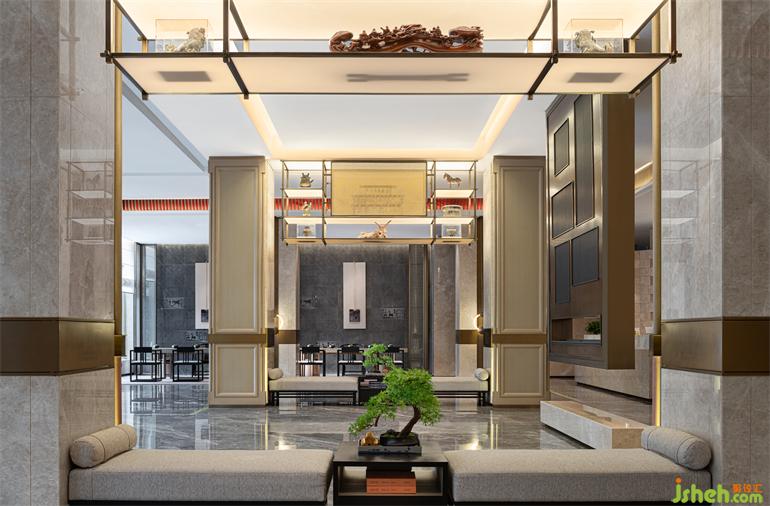 甫入前廳,便猶如踏進(jìn)回溯歷史的時(shí)光漫卷之中,夜郎古國的千載流光融入現(xiàn)代設(shè)計(jì)肌理,簡約利落的設(shè)計(jì)筆觸下滿含深意。酒店設(shè)計(jì)師將夜郎風(fēng)貌呈現(xiàn)于中央LED屏之上,將夜郎獸面紋糅合于隔斷與石柱之間,將詩仙太白“隨風(fēng)直到夜郎西”的愁心具象于燈火之中,在理石塑成的極簡建筑肌骨中賦活民族文化的精魂,讓古典元素與現(xiàn)代審美共生共榮。