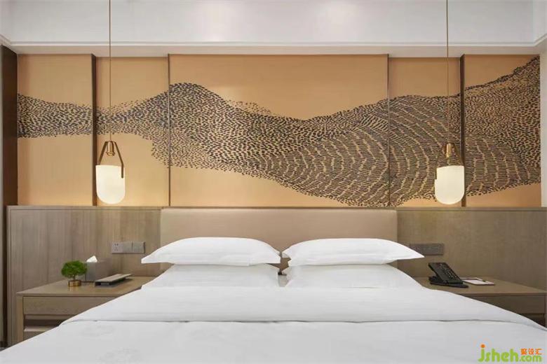 客房的硬裝設(shè)計(jì)延續(xù)了極簡與硬朗的風(fēng)格,多以溫潤的原木材質(zhì)鋪陳,在當(dāng)代與傳統(tǒng)之間找到了靈感的最佳契合點(diǎn)。標(biāo)準(zhǔn)大床房取意于龍泉淺灘的流沙之景,貴州觀山湖酒店設(shè)計(jì)將沙礫翻涌的畫面具象為巨幅壁畫,滿鋪在房間的床頭背景,在霎那間給旅客帶來心靈震撼的同時(shí),也將濃厚的貴州印象嵌入旅者的記憶,使自然意趣與人文精神實(shí)現(xiàn)貫通統(tǒng)一。