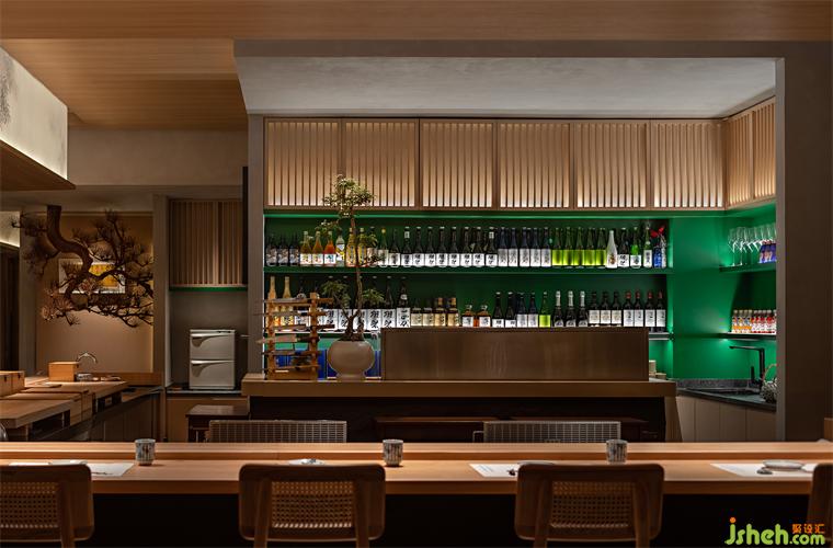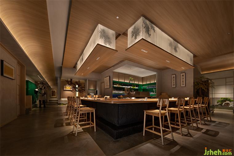 公共區(qū)域分為板前料理區(qū)與景觀卡位。料理區(qū)采用傳統(tǒng)半開放就餐形式,深圳晴舒料理設(shè)計師摒棄復(fù)雜繁飾,僅保留檜木、和紙及微水泥等自然材質(zhì)作洗練表達(dá)。單一簡潔的裝飾布局不僅體現(xiàn)了侘寂幽玄的至簡之美,更避免了空間裝飾喧賓奪主的可能,讓食客更能專注于食材品質(zhì)與用餐過程,品味料理本身的獨特魅力。
