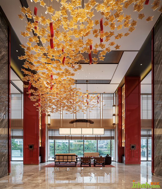 “東風(fēng)夜放花千樹(shù),更吹落,星如雨”,踏入大堂,即可自設(shè)計(jì)語(yǔ)言中感受“火樹(shù)銀花不夜天”的盛大場(chǎng)景,正紅立柱如朱門(mén)開(kāi)敞,以古典禮儀展示迎賓納福之姿??臻g中央以大理段式通用貝幣為景觀賦形,將段氏文化融鑄于空間的骨骼脈絡(luò)之中,于一物一景間氤氳氏族情懷,一磚一木中匯集文人雅韻。