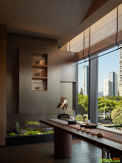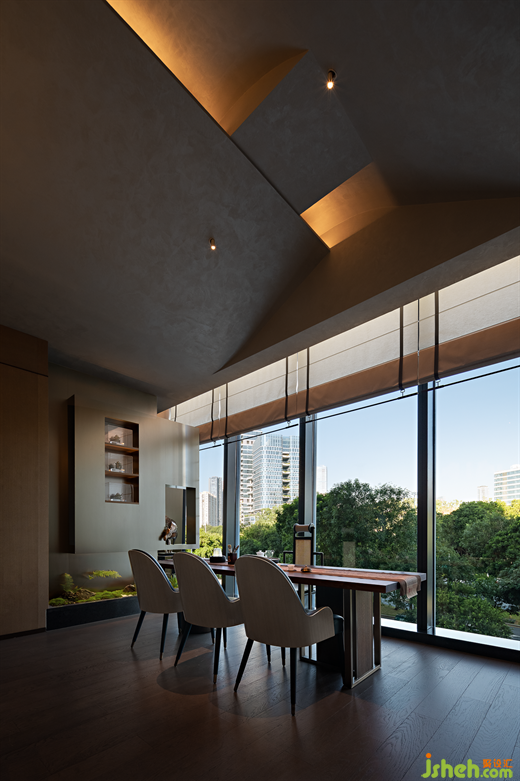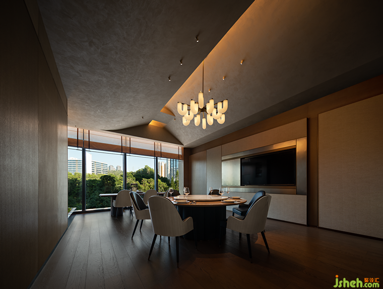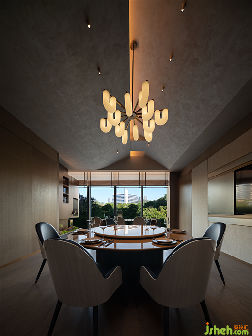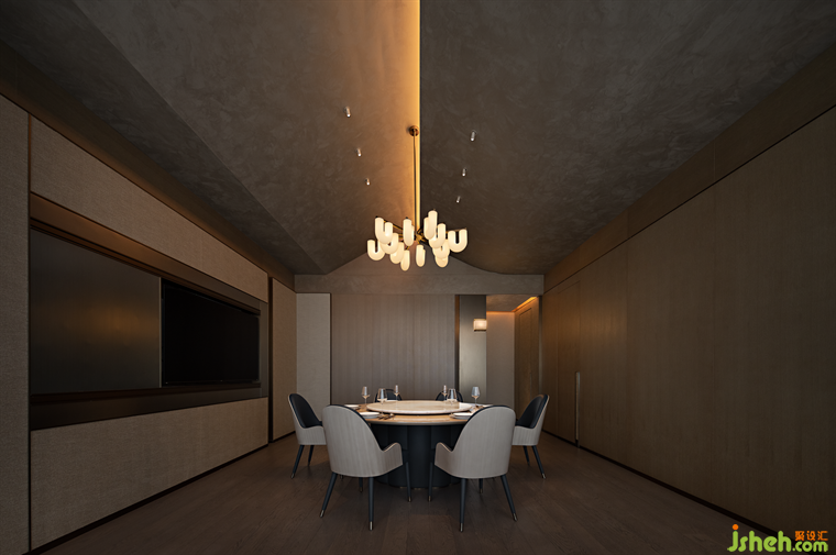 “銀箏夜”主題包間以古銀為主色調(diào),潮菜餐廳設(shè)計師將青銅器和銀的質(zhì)感相結(jié)合,為墻面與藝術(shù)燈具增添濃郁的金屬質(zhì)感氣息。 青銅器在古時被稱為"金"或"吉金",是崇高的禮器,亦是聲譽(yù)極盛的藝術(shù)寶藏。 泠泠銀箏通古意,錚錚余弦曉詩情。 設(shè)計師將銀與青銅融入空間,給予客人最頂級的禮遇與款待。The private room named "Silver Zither Night" revolves around the theme of ancient silver, with the designer artfully blending the textures of bronze and silver to imbue the walls and art lamps with a luxurious metallic ambiance. In ancient times, bronze was revered as a noble ceremonial weapon and an esteemed artistic treasure, known as "Jin" or "Jijin". The resonating melodies of the silver zither hold profound significance, and the poetic emotiveness lies within the harmonious vibrations of its strings. By integrating silver and bronze elements into the space, the designer bestows upon the guests the utmost level of courtesy and hospitality.