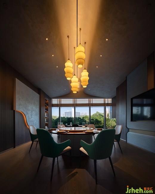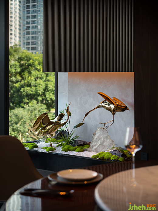 鶴是中國傳統(tǒng)文化中極富風(fēng)致雅韻的元素,道骨澄心,仙姿天壽,設(shè)計師將瑞鶴元素融入包間設(shè)計中,潮菜餐廳設(shè)計以藝術(shù)裝置具化瑞鶴起舞的景象,臨水弄影的姿態(tài)栩栩如生,將自然文心與古意雅趣包容于一域。Crane is an element of traditional Chinese culture that is very rich in elegance, Taoist bone and heart, immortal posture and longevity, the designer will incorporate the crane element into the design of the private room, with art installations to materialize the scene of the crane dancing, and the gesture of the water in the shadow of the lifelike, will be the natural heart of the literature and the old-fashioned elegance of a region.