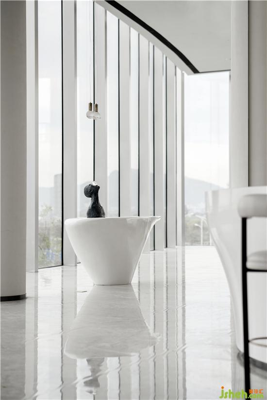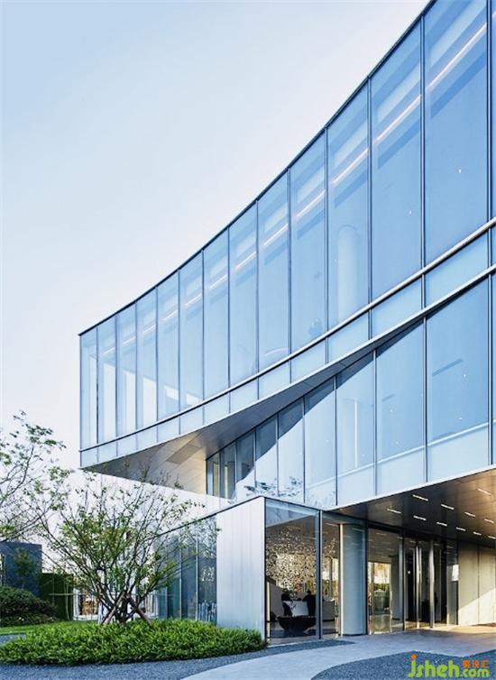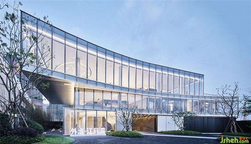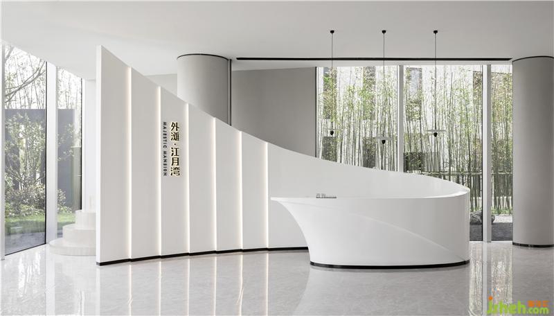 設(shè)計師以建筑自有的弧面形態(tài)和通透玻璃界面,將引景入室作為設(shè)計的切入點,以不動聲色之美學(xué),收納人杰地靈的自然之饋贈。售樓處設(shè)計