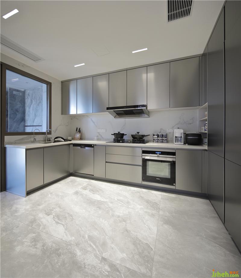 餐廳與廚房半開放式一字排開,相互聯(lián)系,互不干擾?,F(xiàn)代拉絲金屬灰與質(zhì)感白在碰撞中融合,沒有夸張與炫目,而是平淡、溫馨,細(xì)膩地表達(dá)出對(duì)生活品質(zhì)的追求,用餐區(qū)也安靜地立在角落,共度這個(gè)短暫的柔軟時(shí)刻。