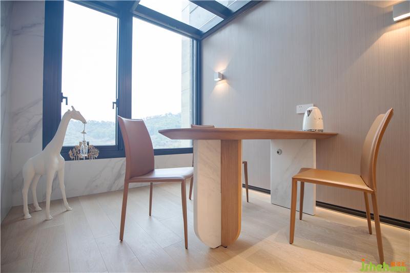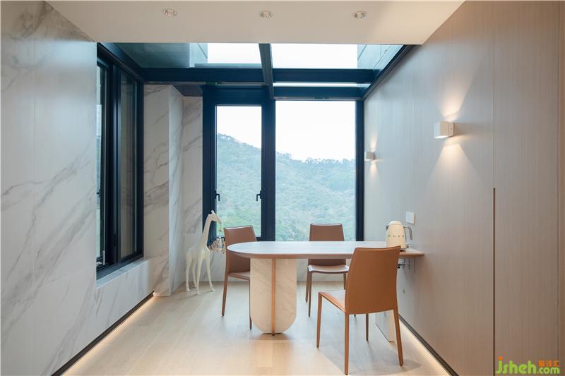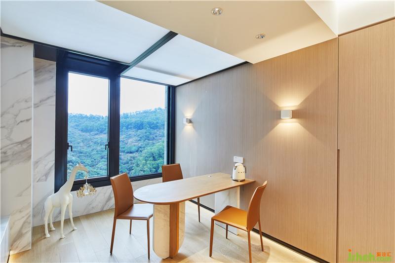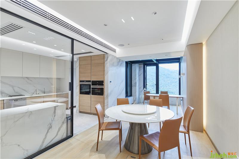 集匯設(shè)計將其廚房與餐廳貫穿通透、讓就餐空間更加現(xiàn)代和更開闊的視野用餐環(huán)境。深圳裝修設(shè)計山景相依,天然的材質(zhì)、休閑的屬性體現(xiàn)現(xiàn)代格調(diào)的高雅