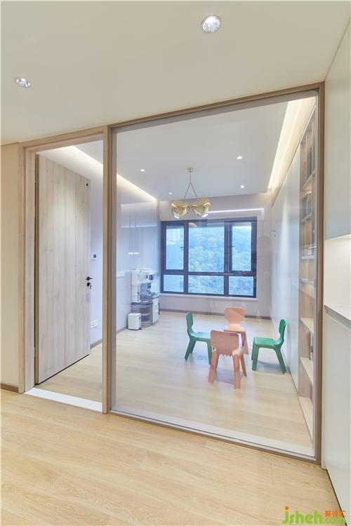 小孩活動(dòng)室不僅是活動(dòng)的空間,附帶智能升降床、霧化玻璃、以小見(jiàn)大的功能分布,設(shè)計(jì)有意共享一部分空間給予過(guò)渡緩沖的,清晨推開窗,能聽見(jiàn)動(dòng)聽的鳥鳴聲,自然規(guī)律,情景交融