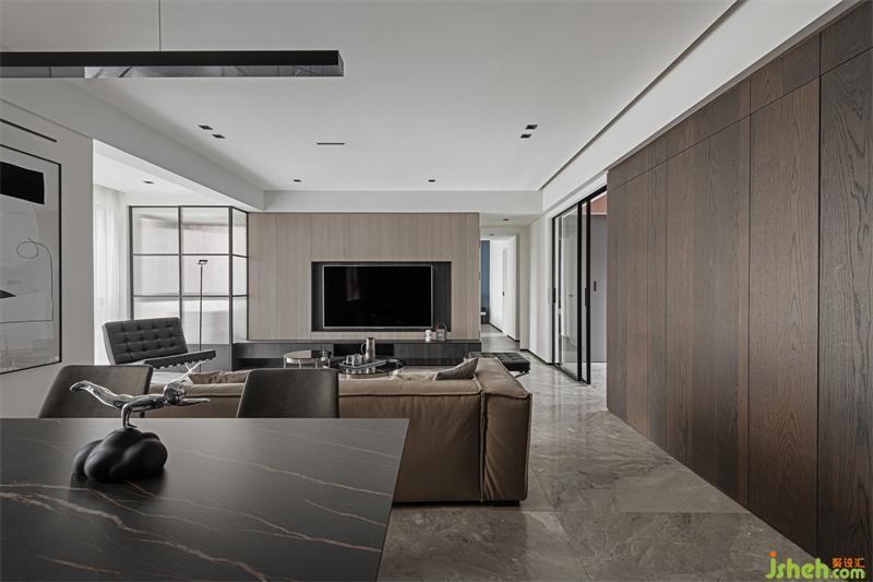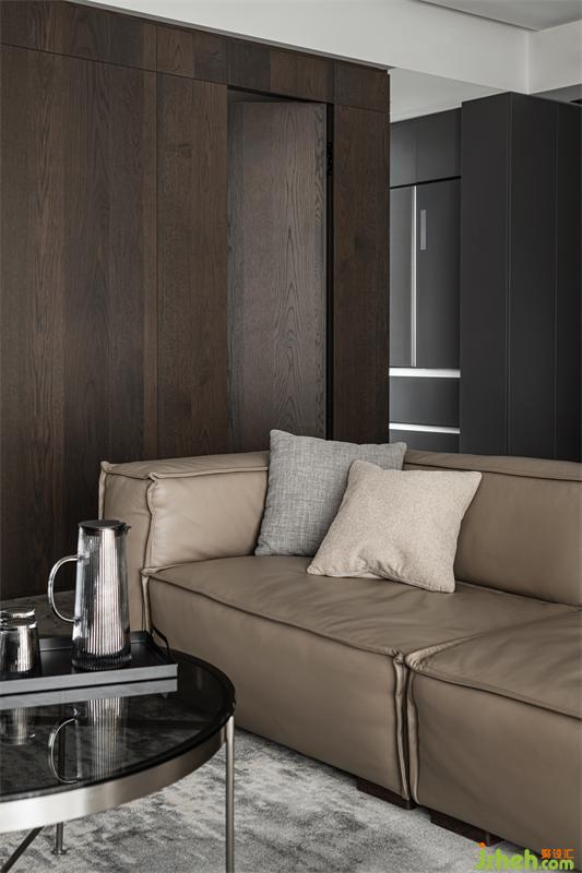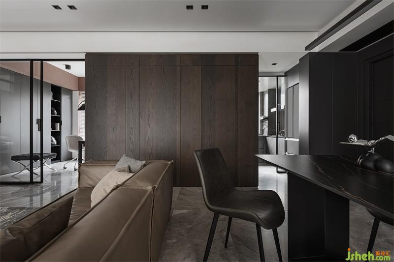 The original kitchen door, bathroom door, and study door of the aisle are designed with different forms and materials to make the corridor look beautiful and full of overall feeling. The original kitchen door is removed to make the space open and the lighting is better; the bathroom door is part of the wooden wall, which is invisible and mysterious; the study door double-opening glass door widens the vision of the entire public area, and greatly improves the daylighting of the entire house. Become bright. The invisible bathroom door has a minimalist visual effect, but it adds a bit of surprise.