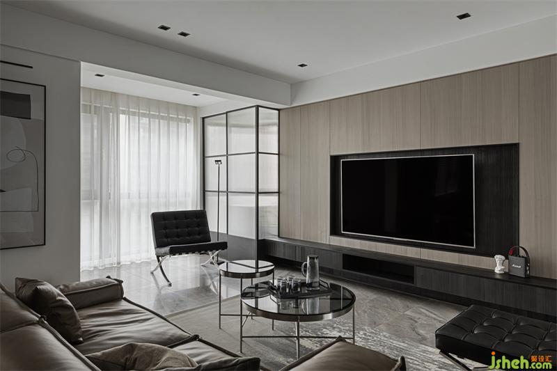 5.生活陽臺移入客廳陽臺原本凹進去位置,完善清潔功能;加上長虹玻璃門的設(shè)計又拓寬了電視墻的視野。
