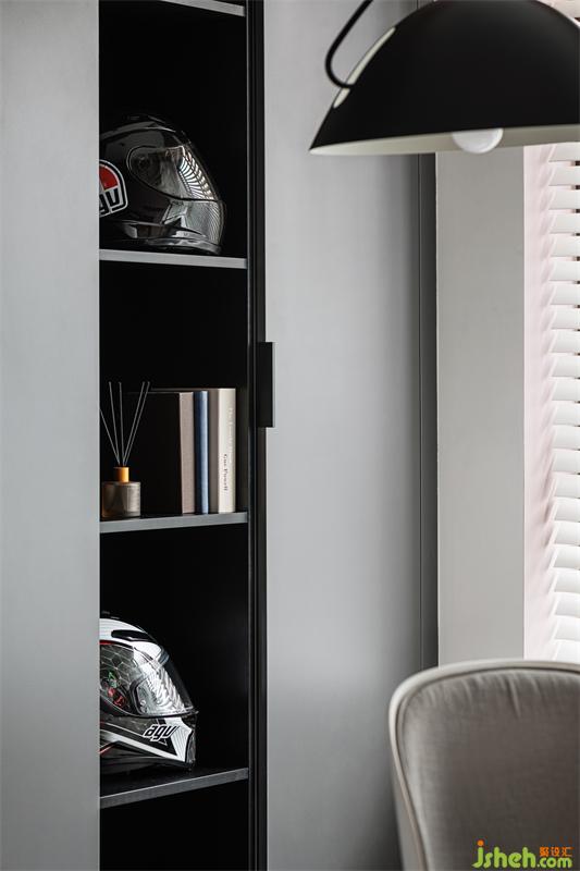 屋主對(duì)書柜要求要儲(chǔ)物性強(qiáng),家居設(shè)計(jì)以封閉柜門為主,小部分開放式柜體,放置個(gè)性化物件增加了空間情緒。