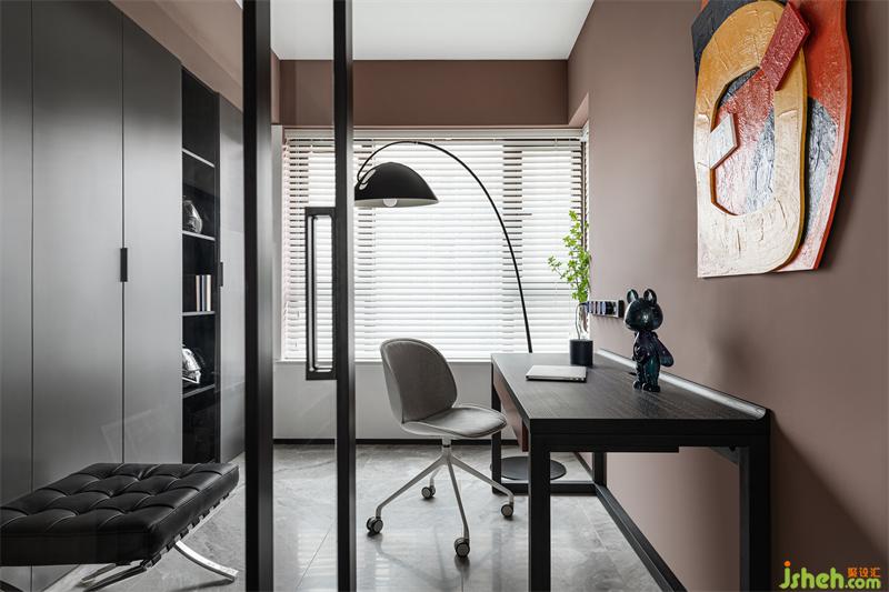 The design of the entire house is simple, elegant and quiet. Under the main tone of gray, we embellish red in the study room, which makes the space present a mysterious color aesthetics. The combination of dark paint, gray floor tiles and gray cabinets gives the study a rigorous feeling, and at the same time it has the color that the owner likes.