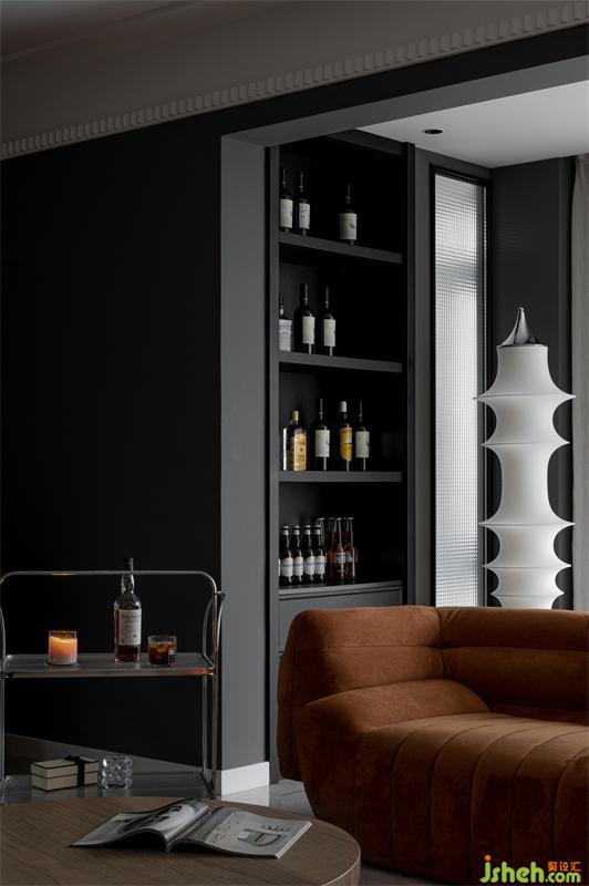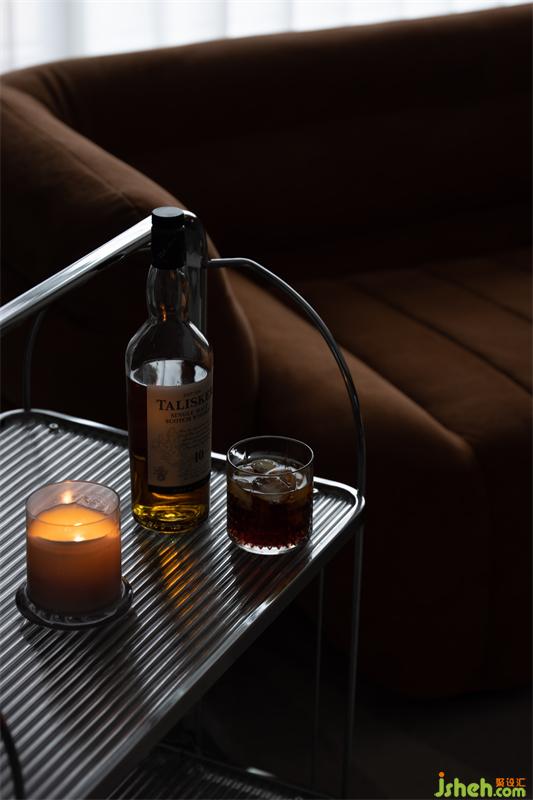 屋主在閑暇時(shí)間喜歡喝酒,我們?cè)陉柵_(tái)搭建后增加了酒柜,推車替代傳統(tǒng)邊幾,方便移動(dòng)。