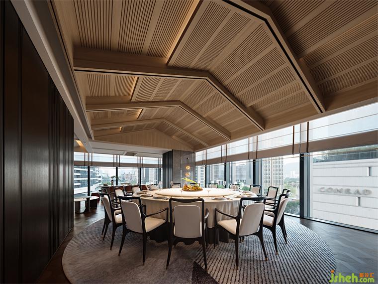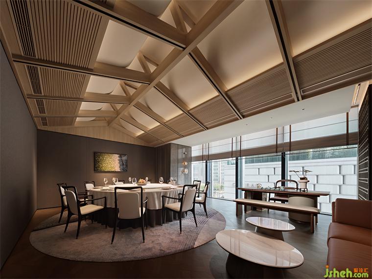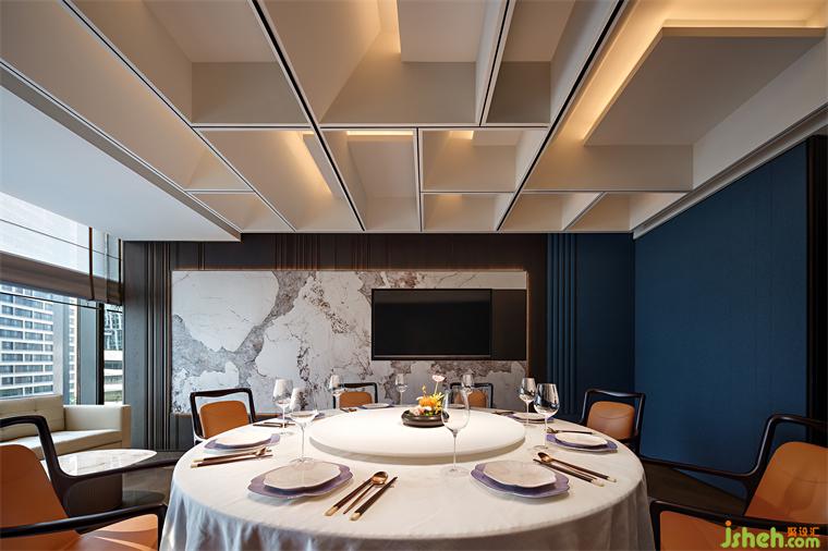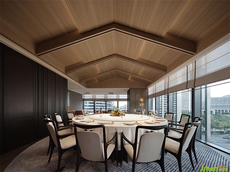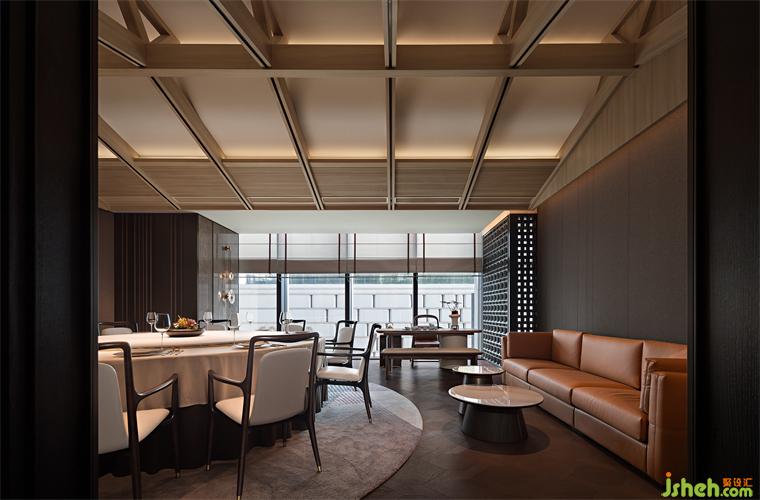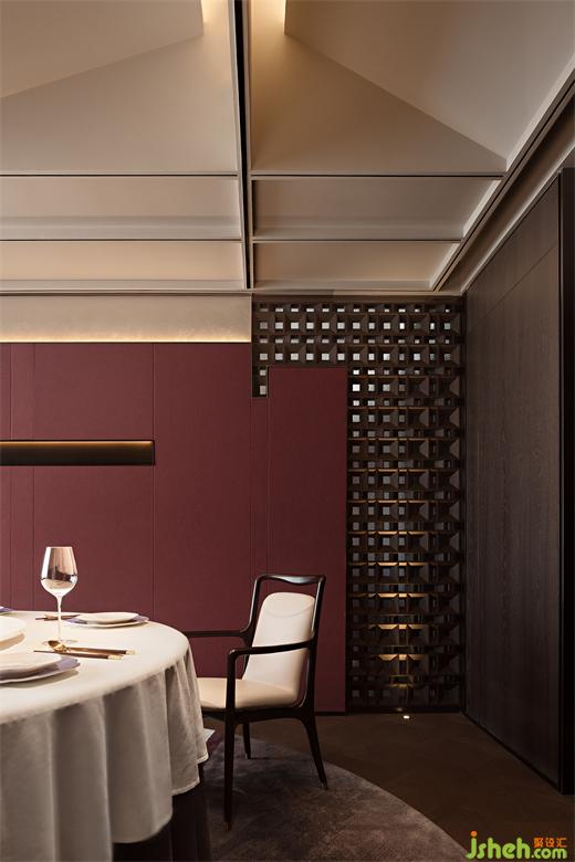 木葉下,江波連,秋月照浦云歇山。云外歡宴,亭下流觴,在親友共慶的時刻,亦有閑情美景為空間點染閑適與寂靜的氛圍。古典窗格隔斷、歇山式天花的運用,即是在石材與木飾面的背景上落一筆精致傳神的點睛之墨,設計師用古雅的藝術筆觸,突破古典與現(xiàn)代的藩籬,餐廳設計以恢弘視角連通不同時代的審美,營造孑然于時光之外的文化雅集。