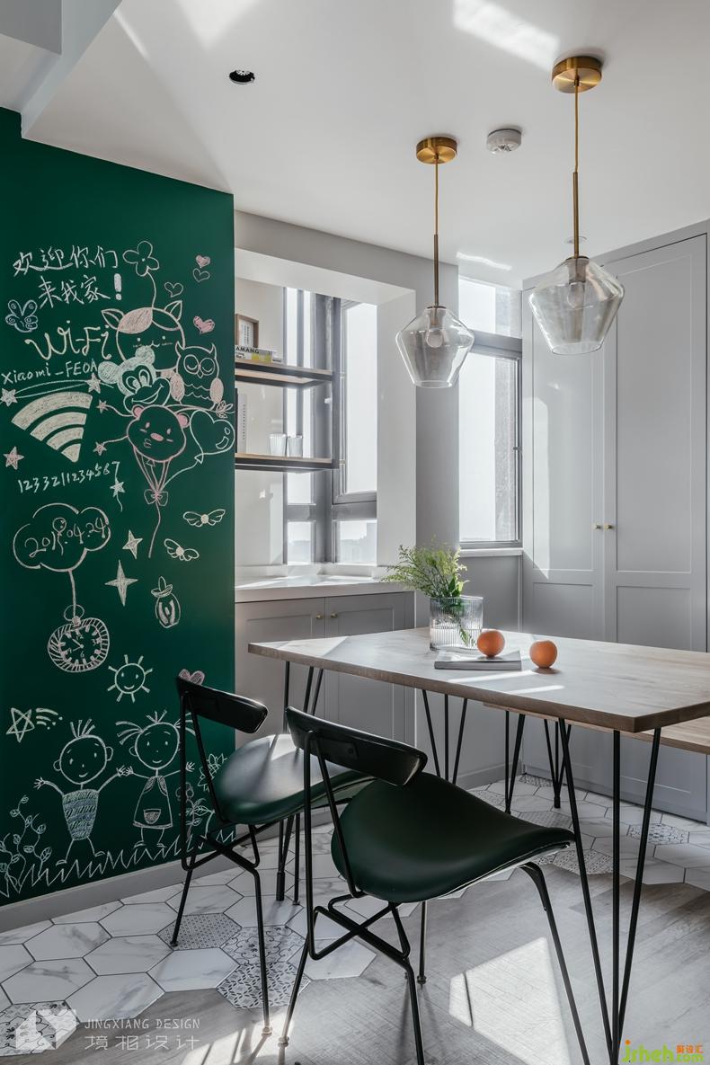 △部分梁體不能改動(dòng),干脆利用梁體打造餐邊柜、高柜,滿足收納需求的同時(shí),消除了拐角。餐廳的一面黑板墻,能讓屋主夫妻在涂鴉之中放松,也為未來的寶寶預(yù)留了涂涂畫畫的空間。