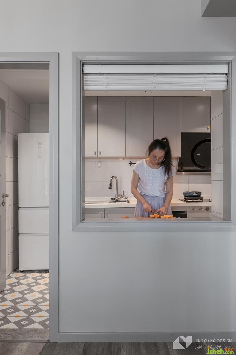 △改造后的廚房面積更大、操作臺(tái)面更充足。白色墻磚、灰色櫥柜,配上地面的花磚,既精致耐看又方便打理。
