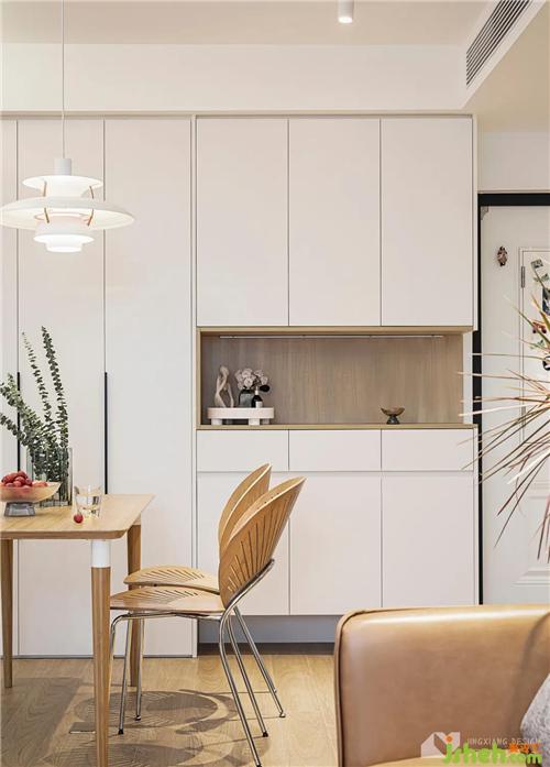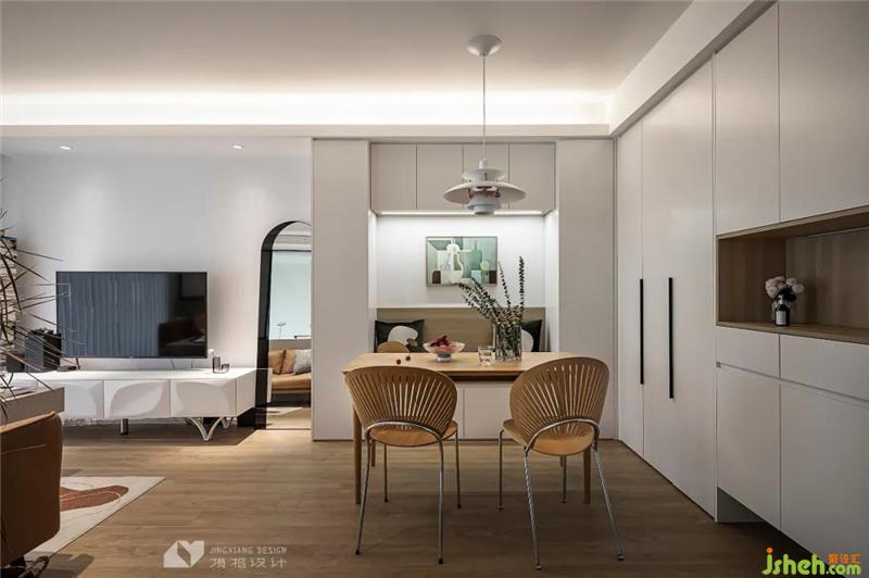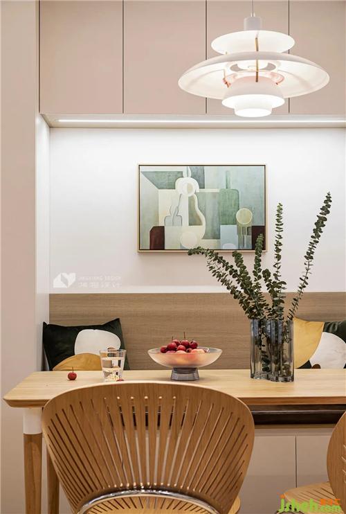 靠墻的一側(cè),定制卡座,減少空間的占用。上方裝有吊柜做收納,卡座底部也做了儲物設(shè)計(jì),彌補(bǔ)了餐邊柜的功能。