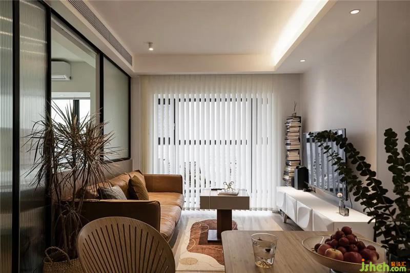 豎型百葉簾分割出客廳、陽臺的界限,卻不妨礙光線的游走,視覺更寬敞、明亮。