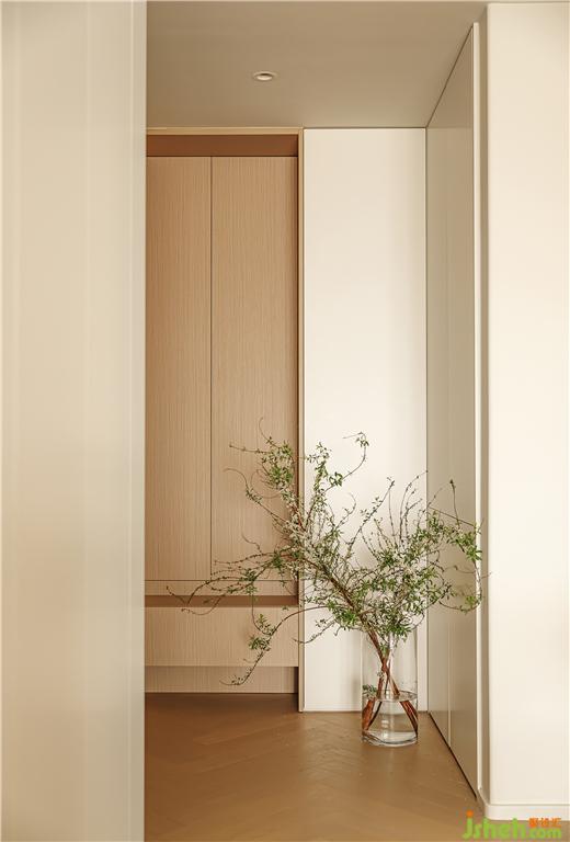 玄關(guān):進(jìn)門推掉廚房墻后做成L型鞋柜,有了足夠的收納空間和換鞋凳