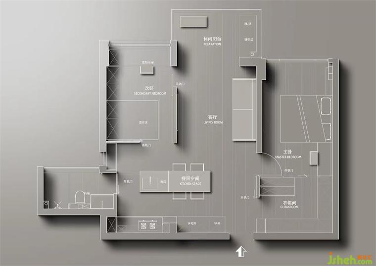 4、主臥設(shè)吊軌門,隔出獨(dú)立的衣帽間,一并實(shí)現(xiàn)空間的內(nèi)外聯(lián)動,構(gòu)建趣味的環(huán)形動線。