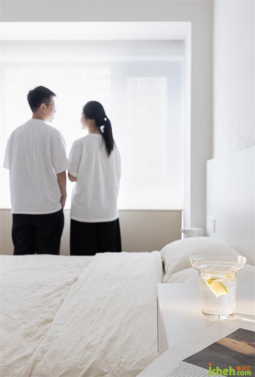 3、次臥兩側(cè)墻體拆改為開合自由的移門,動線自由,空間感得到最大限度延伸,移除室內(nèi)飄窗改為書桌,靠墻高柜嵌入墨菲床,滿足臨時留宿,次臥功能復(fù)合,利用率最大化。