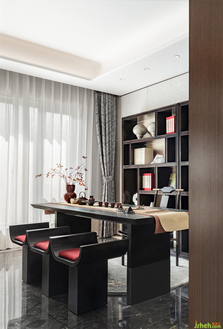 茶室壺中煮茶話論今古,開卷沉思或提筆沉吟,于書卷梵香間尋禪思境,樣板房設(shè)計一種氣質(zhì)東方意境在此肆意流淌。似乎引導身心在此歸于平靜,沏上一盞清茶,一派清幽之境悄然生發(fā)。