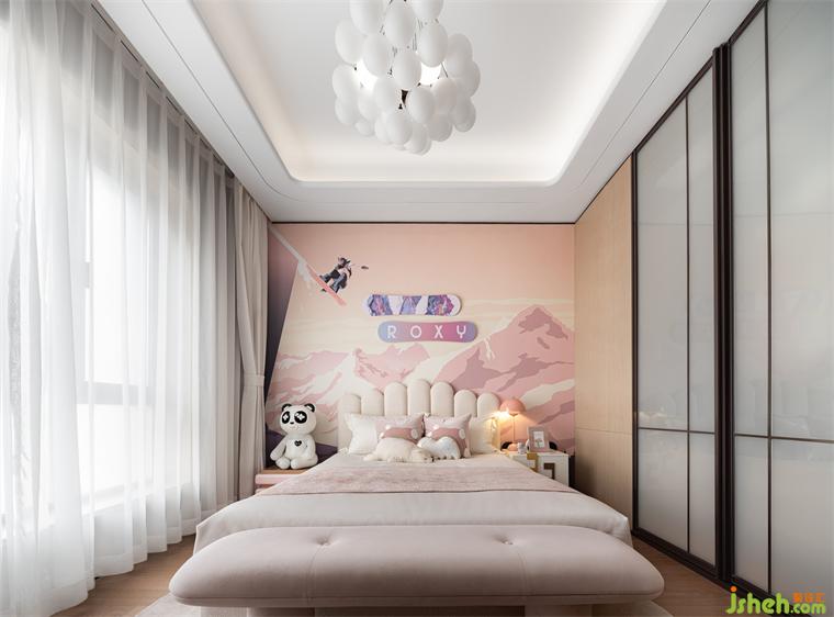 女主人空間在沙發(fā)背景植入玻璃屏風如點睛之筆,空間的風雅意蘊鋪滿,傳遞出現代與中式氣韻,樣板房設計營造了自洽怡然的居家氛圍。