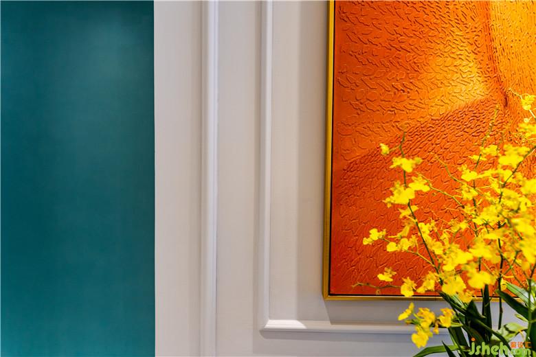 石膏線條在凸出的大理石電視背景墻左右兩側(cè)各自成為風景,更妙的是,左側(cè)的盆栽就像是長在畫里一樣,與墻面對比,橙色+黃色+藍綠色這樣的顏色搭配,給予了房子更多的趣味!