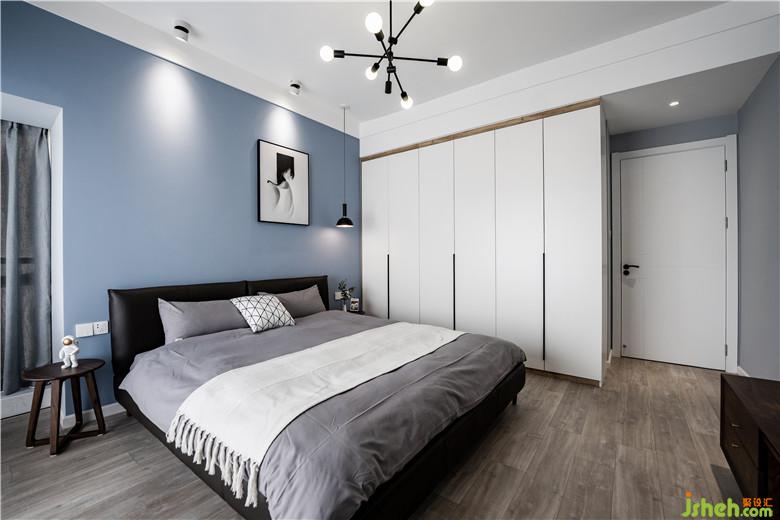 次臥。Johnny哥希望能給到業(yè)主無限舒適感,所以次臥的衛(wèi)生間也是采用干濕分離,將洗漱區(qū)獨立開來。墻面藍灰撞色、小方磚的運用讓房間的北歐風情更充足。胡桃木色的原木家具,搭配白色到頂大衣柜可以將儲物功能發(fā)揮到最大,也不留衛(wèi)生死角。打造安眠空間,靜謐而自在。