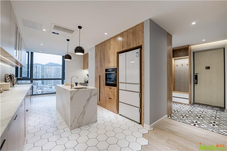 廚房無主燈設計,讓人操作起來更方便,避免背光操作的現象~原木與大理石材質總是如此相搭配,溫潤而細膩。
